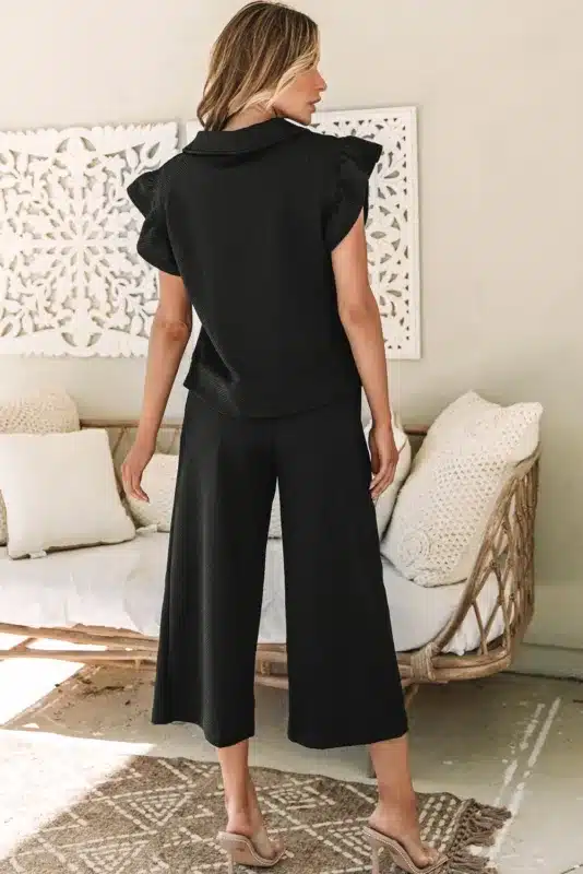 Black Textured Flutter Sleeve Top Wide Leg Pants Set