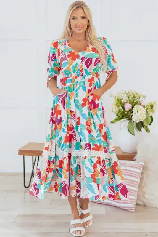 Rose Red Floral Knot Puff Sleeve V Neck Buttoned Front Split Lace Maxi Dress
