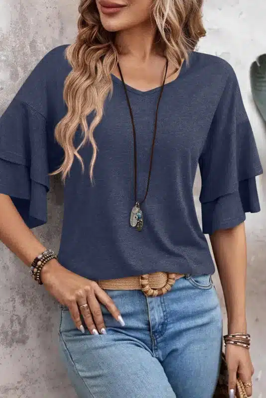 Sail Blue Solid Colour V-Neck Double Layer Sleeve Loose T-Shirt