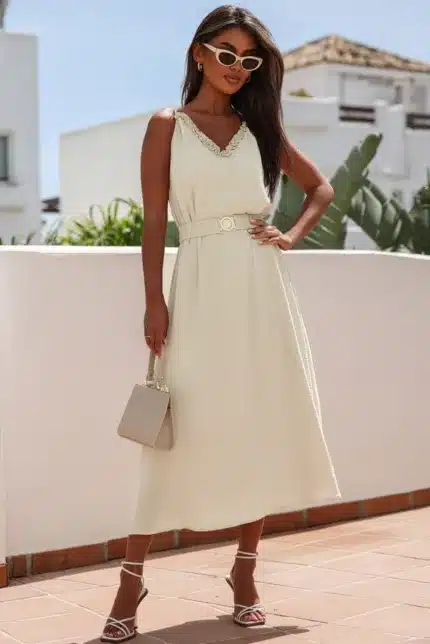 Apricot V Neck Sleeveless Maxi Dress with Elastic Belt
