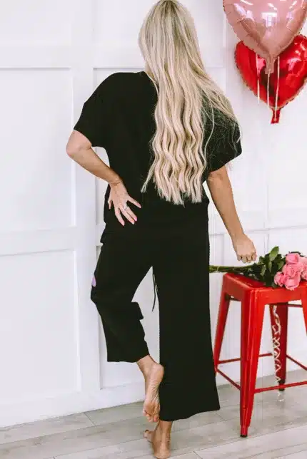Black Sequin Heart Popping Graphic Textured 2pcs Outfit