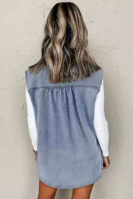 Beau Blue Denim Flap Pocket Curved Hem Shirt Vest