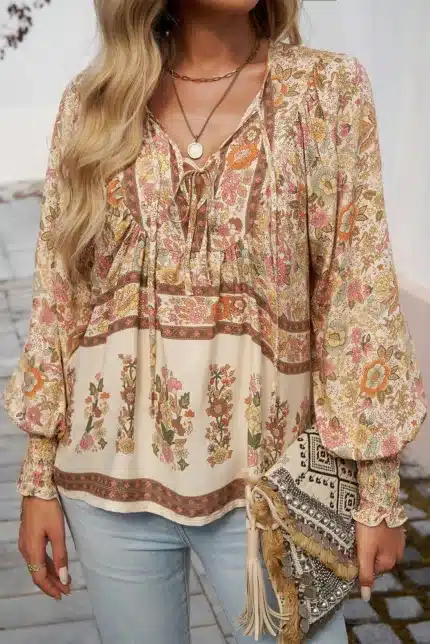 Light French Beige Floral Print Bow Pintuck Bust Half Puff Sleeve Blouse Top