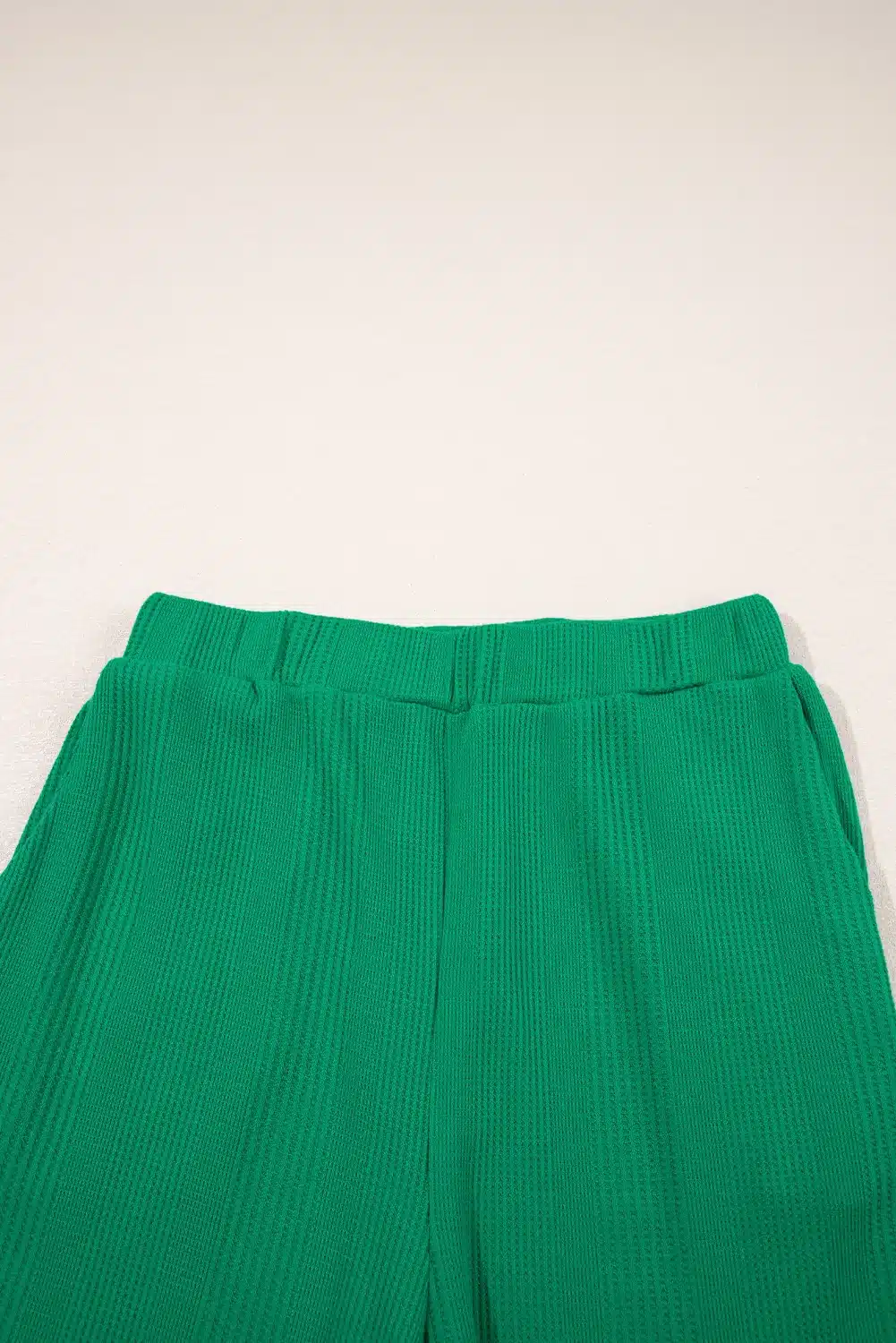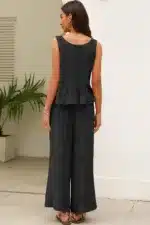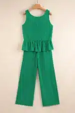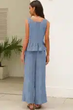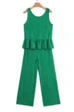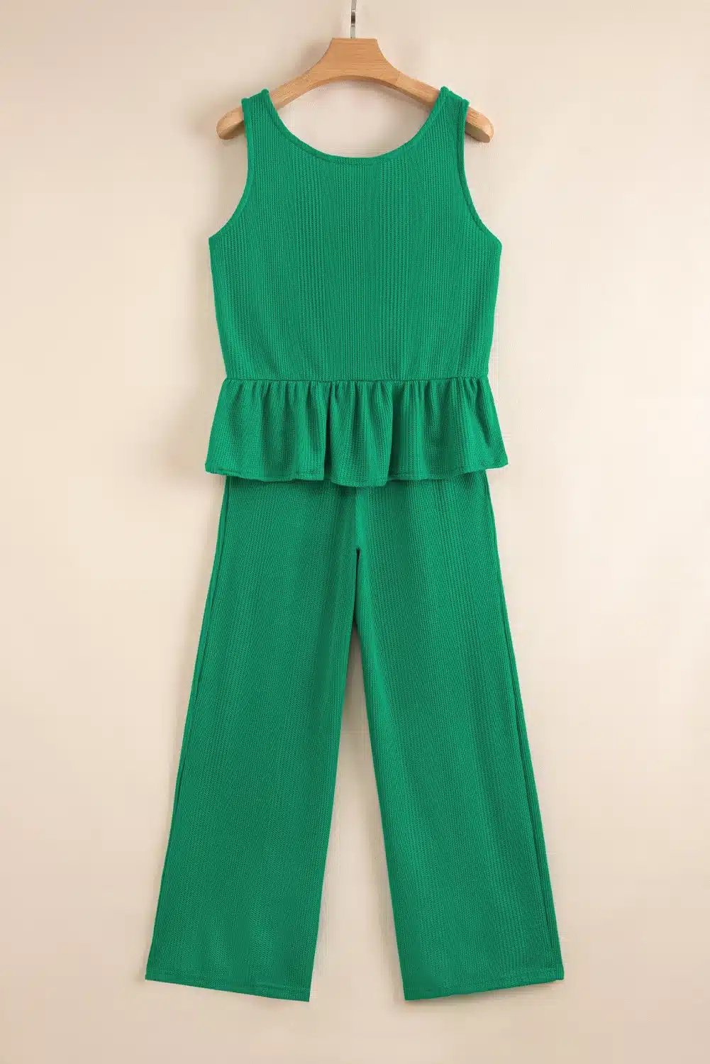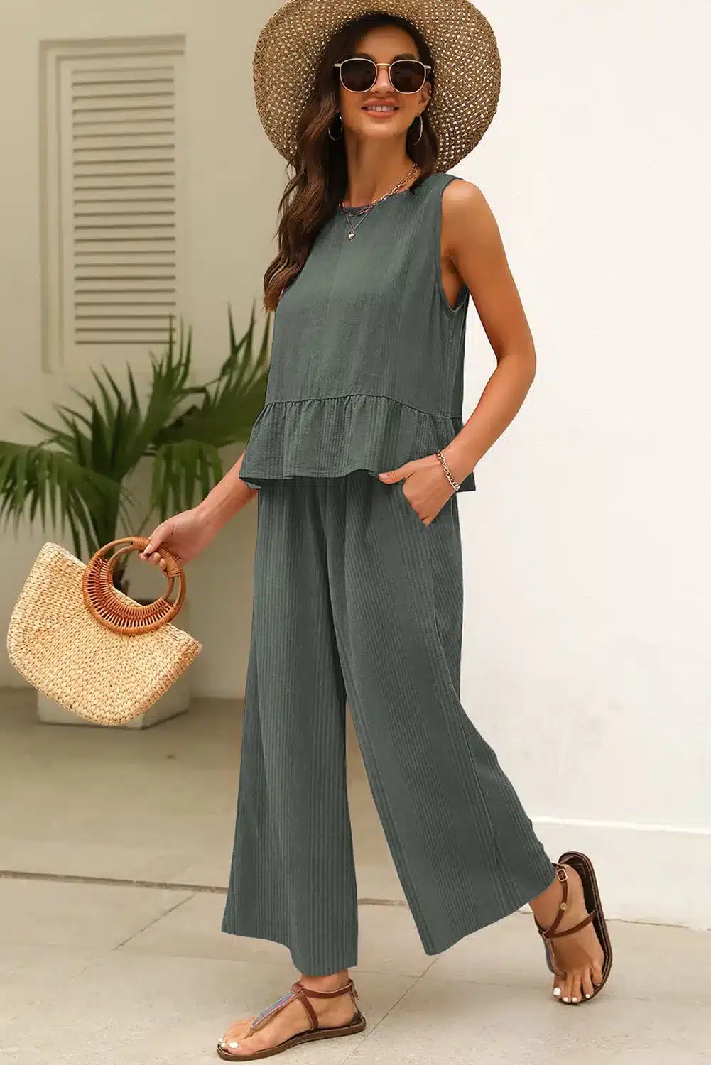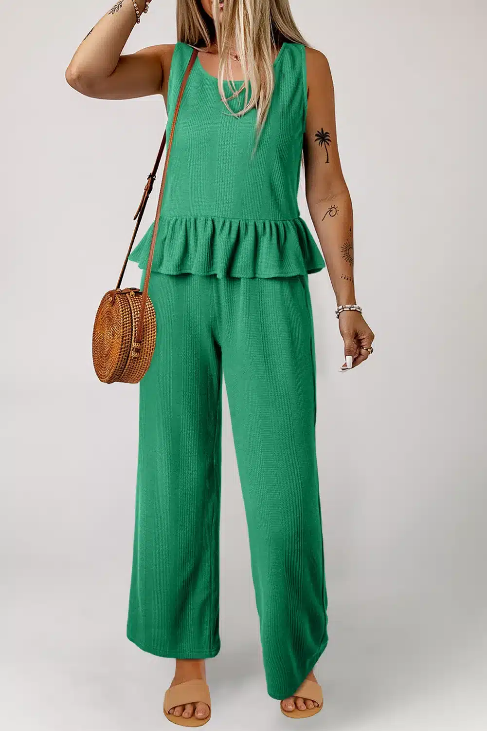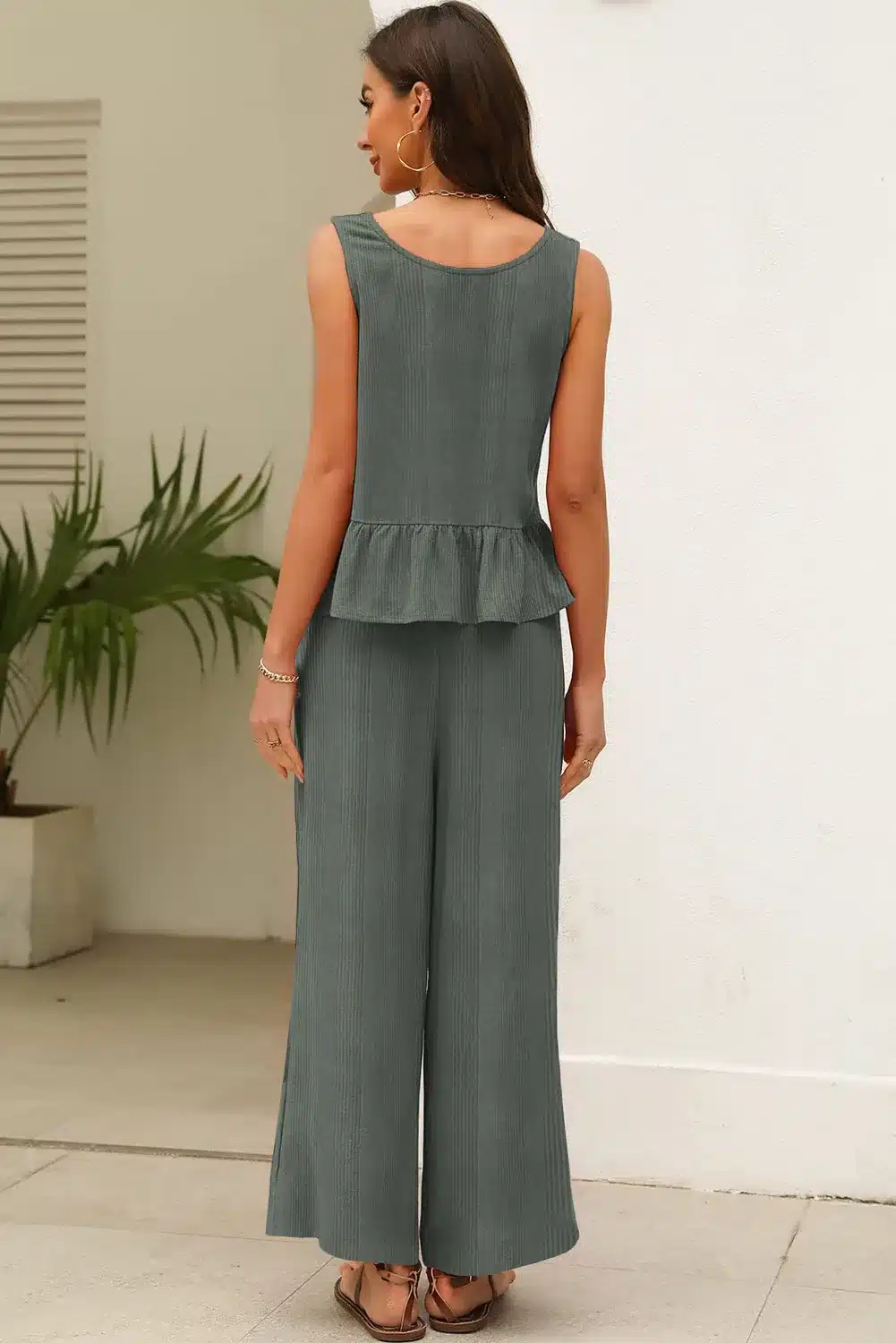 Beau Blue Solid Color Ribbed Ruffle Tank Top and Pants Set