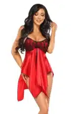 This elegant and incredibly sexy chemise is crafted from stylish, shiny red satin and adorned with black lace on the upper part. The unique cut beautifully highlights feminine curves. Featuring adjustable straps for a perfect fit, it comes complete with a matching satin thong. The entire set exudes seductive allure, making it perfect for the bedroom and beyond. Packaged elegantly with a picture showcasing the product, it’s a stunning addition to any lingerie collection.