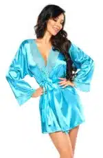 Wrap yourself in pure luxury with the Sherie Peignoir Turquoise Robe! Made from high-quality satin, this turquoise satin robe feels irresistibly soft against your skin, giving you that glamorous, pampered feeling every time you wear it. Key Features: Luxurious satin fabric: Crafted from high-quality satin in a vibrant turquoise colour for a look that?s as stunning as it is comfortable. Delicate lace trim: Sensual lace detailing on the neckline and cuffs adds an extra touch of charm and elegance. Adjustable satin belt: Cinch the waist with the adjustable tie belt for a perfect, flattering fit. Matching thong: Complete the set with the included matching thong for a look that?s effortlessly chic. Perfect gift: Arrives in elegant packaging with a product photo, making it the ultimate luxury gift for someone special?or a treat for yourself! Indulge in the Sherie Peignoir Turquoise Robe and bring a little luxury to your everyday routine!