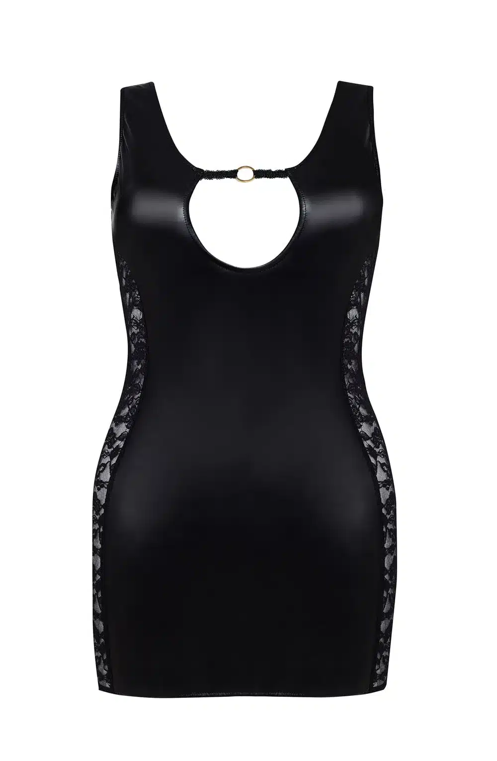 Turn heads with this alluring wetlook black mini dress featuring intricate lace panels on the sides. The sleek, glossy finish accentuates your curves, while the side lace panels add a touch of elegance and intrigue. Perfect for making a bold statement, this mini dress arrives packaged in a Beauty Night box, making it an ideal gift or a special treat for yourself.