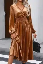 Camel Wrap V Neck Smocked High Waist Velvet Midi Dress
