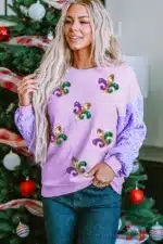Orchid Petal Sequin Patchwork Long Sleeve Fleur de Lis Patched Pattern Top