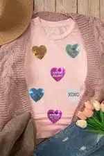 Pink Sequin Valentines Lettering Heart Patched Crewneck T Shirt