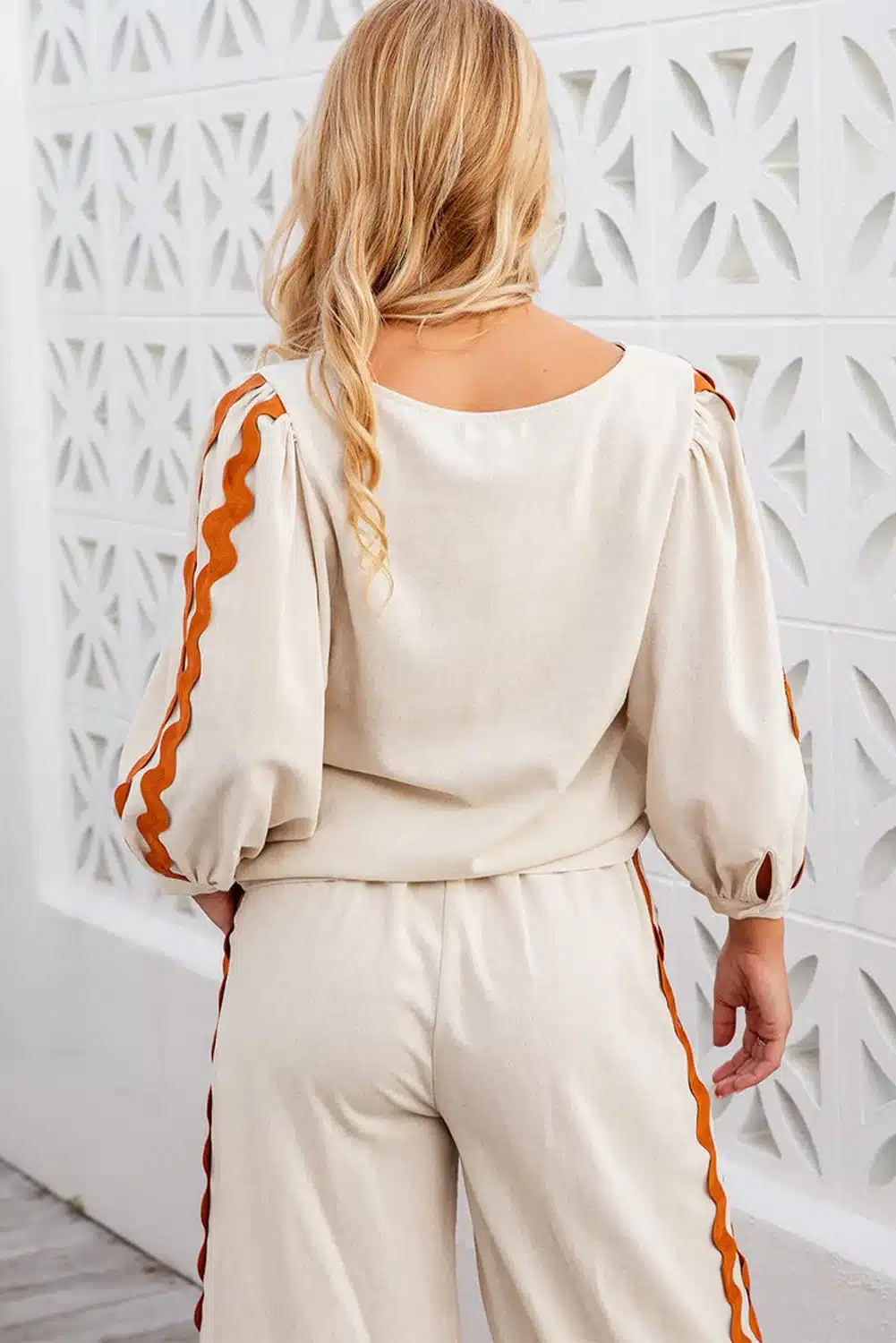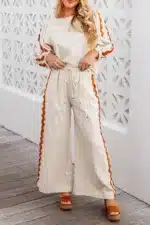 White Colorblock Ric Rac Trim Sleeve Top and Wide Leg Pants Set