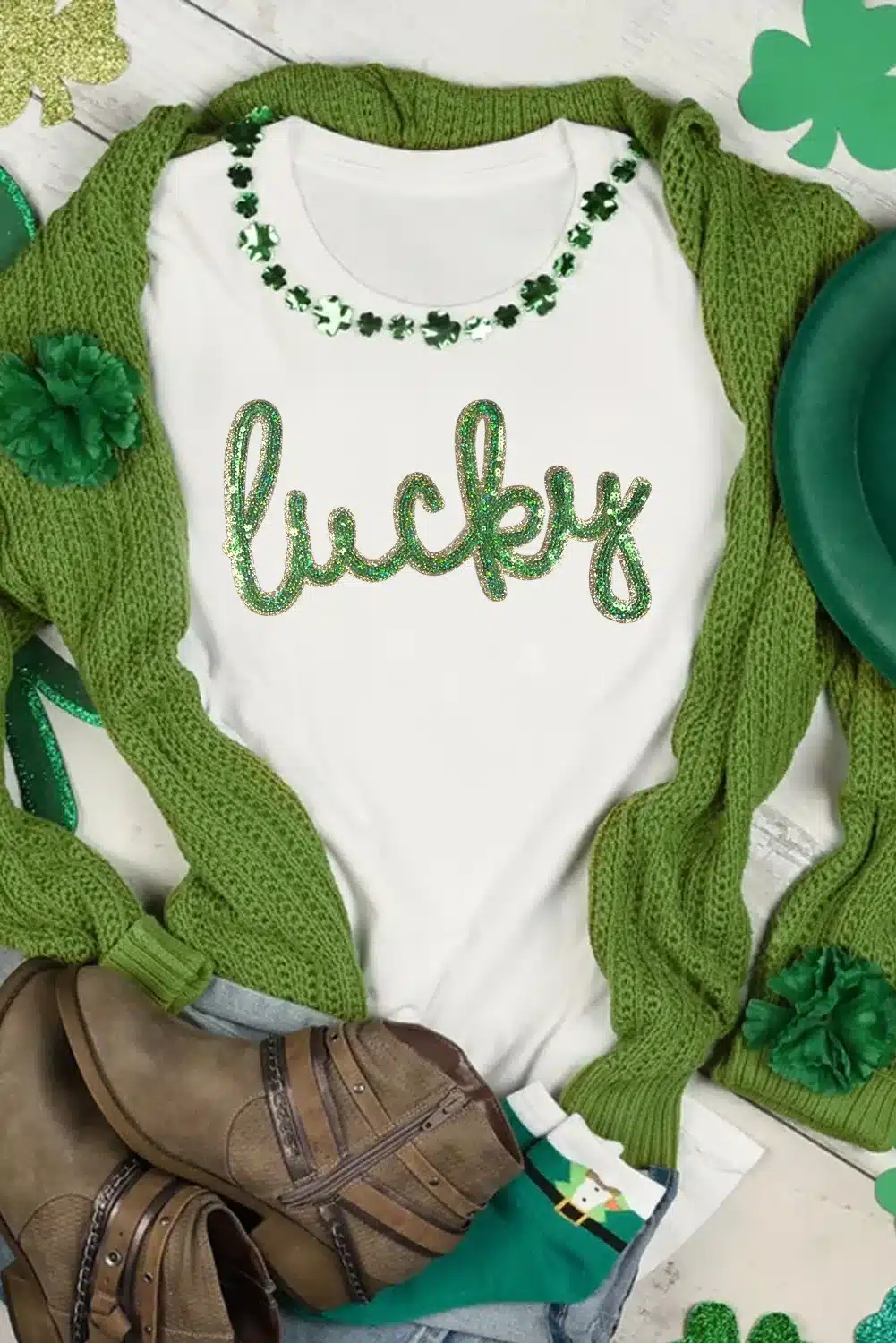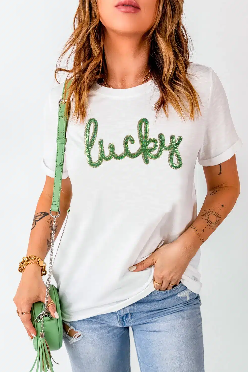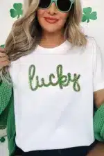 White Sequined Lucky St.Patricks Day Graphic Tee