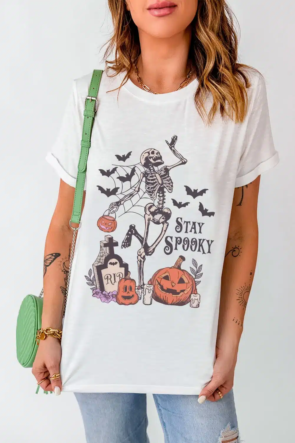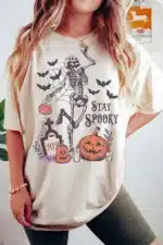 - The “STAY SPOOKY” slogan combined with skull and pumpkin graphics creates a playful design.