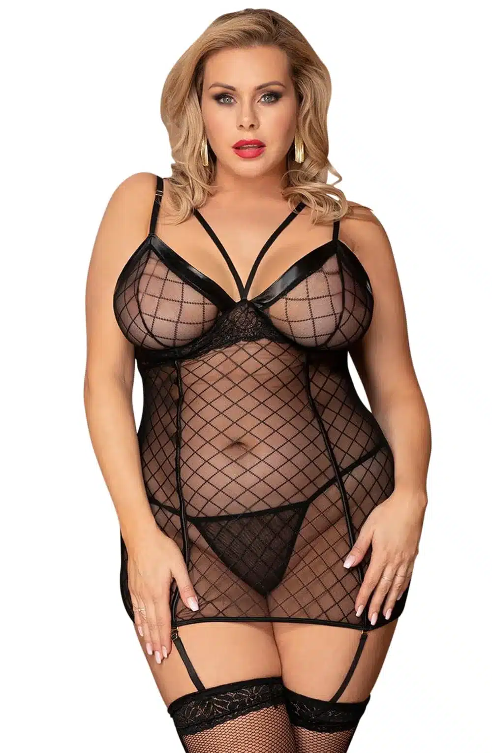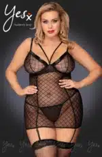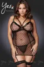 A seductive mesh chemise with feminine lace and wet look trim along the plunging neck line. The chemise has adjustable shoulder straps and arrives with matching black mesh thong and removable suspender straps. PLEASE NOTE: Stockings not included. Please see related products. This item arrives packaged in a YesX satin bag.