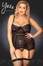 An irresistible chemise with elegant floral lace and sultry sheer fabric. The chemise has adjustable shoulder straps and arrives with matching sheer fabric thong and removable suspender straps. PLEASE NOTE: Stockings not included. Please see related products. This item arrives packaged in a YesX satin bag.