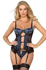 A beautiful lingerie set with stunning delicate lace. This set features underwired cups with adjustable shoulder straps and hook and eye back fastening. Matching thong is included and the suspender straps are removable. PLEASE NOTE: Stockings not included. Please see related products. This item arrives packaged in a YesX satin bag.