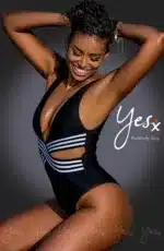 Classic and sexy black swimsuit that features a plunging neck and striking white design with cut out panels.? This figure flattering swimsuit includes removable pads. This item arrives packaged in a YesX satin bag.